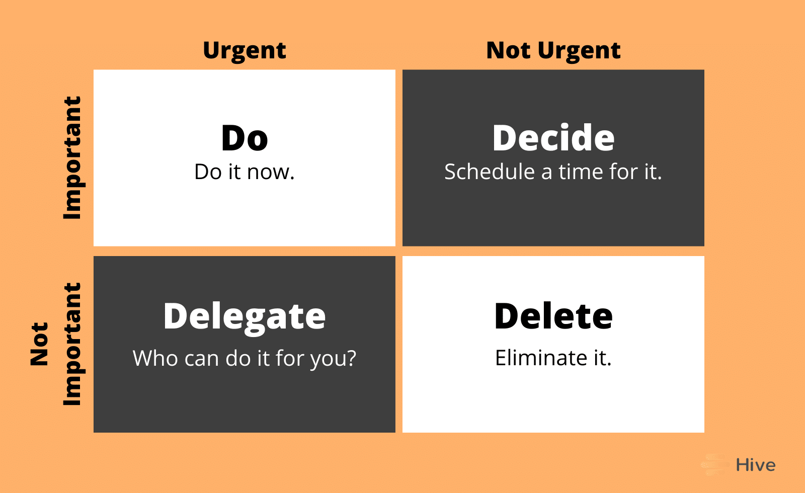 The Eisenhower Matrix is also known as the time management matrix, the Eisenhower Box, and the urgent-important matrix. This tool helps you divide your tasks into four categories: the tasks you’ll do first, the tasks you’ll schedule for later, the tasks you’ll delegate, and the tasks you’ll delete.